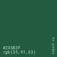 Цвет #235B3F в цветовой модели RGB обозначается тремя октетами (35, 91, 63) в десятичном формате и #235B3F в шестнадцатиричном (hex) формате, которые являются интенсивностью красного 35 (hex 23), интенсивность зелёного 91 (hex 5B) и интенсивность синего 63 (hex 3F).