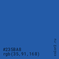 Цвет #235BA8 в цветовой модели RGB обозначается тремя октетами (35, 91, 168) в десятичном формате и #235BA8 в шестнадцатиричном (hex) формате, которые являются интенсивностью красного 35 (hex 23), интенсивность зелёного 91 (hex 5B) и интенсивность синего 168 (hex A8).