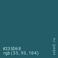 Цвет #235D68 в цветовой модели RGB обозначается тремя октетами (35, 93, 104) в десятичном формате и #235D68 в шестнадцатиричном (hex) формате, которые являются интенсивностью красного 35 (hex 23), интенсивность зелёного 93 (hex 5D) и интенсивность синего 104 (hex 68).