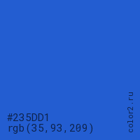 Цвет #235DD1 в цветовой модели RGB обозначается тремя октетами (35, 93, 209) в десятичном формате и #235DD1 в шестнадцатиричном (hex) формате, которые являются интенсивностью красного 35 (hex 23), интенсивность зелёного 93 (hex 5D) и интенсивность синего 209 (hex D1).
