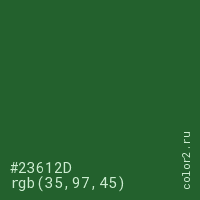 Цвет #23612D в цветовой модели RGB обозначается тремя октетами (35, 97, 45) в десятичном формате и #23612D в шестнадцатиричном (hex) формате, которые являются интенсивностью красного 35 (hex 23), интенсивность зелёного 97 (hex 61) и интенсивность синего 45 (hex 2D).