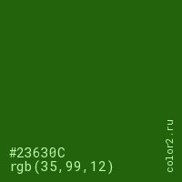 Цвет #23630C в цветовой модели RGB обозначается тремя октетами (35, 99, 12) в десятичном формате и #23630C в шестнадцатиричном (hex) формате, которые являются интенсивностью красного 35 (hex 23), интенсивность зелёного 99 (hex 63) и интенсивность синего 12 (hex 0C).