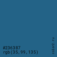 Цвет #236387 в цветовой модели RGB обозначается тремя октетами (35, 99, 135) в десятичном формате и #236387 в шестнадцатиричном (hex) формате, которые являются интенсивностью красного 35 (hex 23), интенсивность зелёного 99 (hex 63) и интенсивность синего 135 (hex 87).