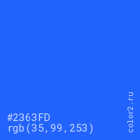 Цвет #2363FD в цветовой модели RGB обозначается тремя октетами (35, 99, 253) в десятичном формате и #2363FD в шестнадцатиричном (hex) формате, которые являются интенсивностью красного 35 (hex 23), интенсивность зелёного 99 (hex 63) и интенсивность синего 253 (hex FD).
