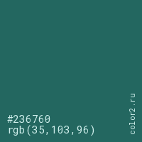 Цвет #236760 в цветовой модели RGB обозначается тремя октетами (35, 103, 96) в десятичном формате и #236760 в шестнадцатиричном (hex) формате, которые являются интенсивностью красного 35 (hex 23), интенсивность зелёного 103 (hex 67) и интенсивность синего 96 (hex 60).