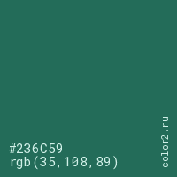 Цвет #236C59 в цветовой модели RGB обозначается тремя октетами (35, 108, 89) в десятичном формате и #236C59 в шестнадцатиричном (hex) формате, которые являются интенсивностью красного 35 (hex 23), интенсивность зелёного 108 (hex 6C) и интенсивность синего 89 (hex 59).