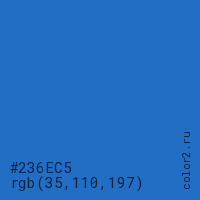 Цвет #236EC5 в цветовой модели RGB обозначается тремя октетами (35, 110, 197) в десятичном формате и #236EC5 в шестнадцатиричном (hex) формате, которые являются интенсивностью красного 35 (hex 23), интенсивность зелёного 110 (hex 6E) и интенсивность синего 197 (hex C5).