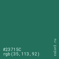 Цвет #23715C в цветовой модели RGB обозначается тремя октетами (35, 113, 92) в десятичном формате и #23715C в шестнадцатиричном (hex) формате, которые являются интенсивностью красного 35 (hex 23), интенсивность зелёного 113 (hex 71) и интенсивность синего 92 (hex 5C).