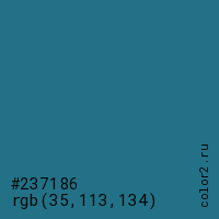 Цвет #237186 в цветовой модели RGB обозначается тремя октетами (35, 113, 134) в десятичном формате и #237186 в шестнадцатиричном (hex) формате, которые являются интенсивностью красного 35 (hex 23), интенсивность зелёного 113 (hex 71) и интенсивность синего 134 (hex 86).