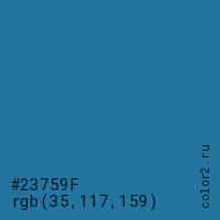 Цвет #23759F в цветовой модели RGB обозначается тремя октетами (35, 117, 159) в десятичном формате и #23759F в шестнадцатиричном (hex) формате, которые являются интенсивностью красного 35 (hex 23), интенсивность зелёного 117 (hex 75) и интенсивность синего 159 (hex 9F).