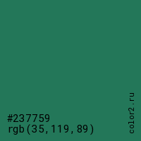 Цвет #237759 в цветовой модели RGB обозначается тремя октетами (35, 119, 89) в десятичном формате и #237759 в шестнадцатиричном (hex) формате, которые являются интенсивностью красного 35 (hex 23), интенсивность зелёного 119 (hex 77) и интенсивность синего 89 (hex 59).