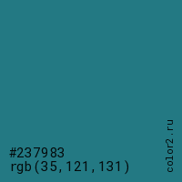 Цвет #237983 в цветовой модели RGB обозначается тремя октетами (35, 121, 131) в десятичном формате и #237983 в шестнадцатиричном (hex) формате, которые являются интенсивностью красного 35 (hex 23), интенсивность зелёного 121 (hex 79) и интенсивность синего 131 (hex 83).