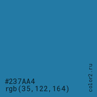 Цвет #237AA4 в цветовой модели RGB обозначается тремя октетами (35, 122, 164) в десятичном формате и #237AA4 в шестнадцатиричном (hex) формате, которые являются интенсивностью красного 35 (hex 23), интенсивность зелёного 122 (hex 7A) и интенсивность синего 164 (hex A4).