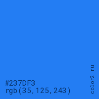 Цвет #237DF3 в цветовой модели RGB обозначается тремя октетами (35, 125, 243) в десятичном формате и #237DF3 в шестнадцатиричном (hex) формате, которые являются интенсивностью красного 35 (hex 23), интенсивность зелёного 125 (hex 7D) и интенсивность синего 243 (hex F3).