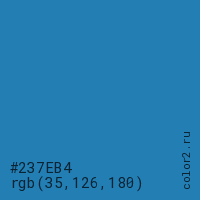 Цвет #237EB4 в цветовой модели RGB обозначается тремя октетами (35, 126, 180) в десятичном формате и #237EB4 в шестнадцатиричном (hex) формате, которые являются интенсивностью красного 35 (hex 23), интенсивность зелёного 126 (hex 7E) и интенсивность синего 180 (hex B4).
