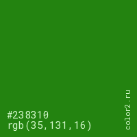 Цвет #238310 в цветовой модели RGB обозначается тремя октетами (35, 131, 16) в десятичном формате и #238310 в шестнадцатиричном (hex) формате, которые являются интенсивностью красного 35 (hex 23), интенсивность зелёного 131 (hex 83) и интенсивность синего 16 (hex 10).