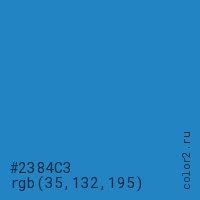 Цвет #2384C3 в цветовой модели RGB обозначается тремя октетами (35, 132, 195) в десятичном формате и #2384C3 в шестнадцатиричном (hex) формате, которые являются интенсивностью красного 35 (hex 23), интенсивность зелёного 132 (hex 84) и интенсивность синего 195 (hex C3).