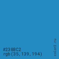 Цвет #238BC2 в цветовой модели RGB обозначается тремя октетами (35, 139, 194) в десятичном формате и #238BC2 в шестнадцатиричном (hex) формате, которые являются интенсивностью красного 35 (hex 23), интенсивность зелёного 139 (hex 8B) и интенсивность синего 194 (hex C2).