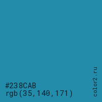 Цвет #238CAB в цветовой модели RGB обозначается тремя октетами (35, 140, 171) в десятичном формате и #238CAB в шестнадцатиричном (hex) формате, которые являются интенсивностью красного 35 (hex 23), интенсивность зелёного 140 (hex 8C) и интенсивность синего 171 (hex AB).