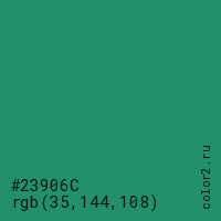 Цвет #23906C в цветовой модели RGB обозначается тремя октетами (35, 144, 108) в десятичном формате и #23906C в шестнадцатиричном (hex) формате, которые являются интенсивностью красного 35 (hex 23), интенсивность зелёного 144 (hex 90) и интенсивность синего 108 (hex 6C).