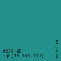Цвет #23918B в цветовой модели RGB обозначается тремя октетами (35, 145, 139) в десятичном формате и #23918B в шестнадцатиричном (hex) формате, которые являются интенсивностью красного 35 (hex 23), интенсивность зелёного 145 (hex 91) и интенсивность синего 139 (hex 8B).