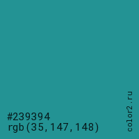 Цвет #239394 в цветовой модели RGB обозначается тремя октетами (35, 147, 148) в десятичном формате и #239394 в шестнадцатиричном (hex) формате, которые являются интенсивностью красного 35 (hex 23), интенсивность зелёного 147 (hex 93) и интенсивность синего 148 (hex 94).