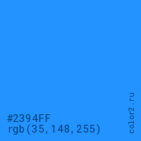 Цвет #2394FF в цветовой модели RGB обозначается тремя октетами (35, 148, 255) в десятичном формате и #2394FF в шестнадцатиричном (hex) формате, которые являются интенсивностью красного 35 (hex 23), интенсивность зелёного 148 (hex 94) и интенсивность синего 255 (hex FF).