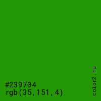 Цвет #239704 в цветовой модели RGB обозначается тремя октетами (35, 151, 4) в десятичном формате и #239704 в шестнадцатиричном (hex) формате, которые являются интенсивностью красного 35 (hex 23), интенсивность зелёного 151 (hex 97) и интенсивность синего 4 (hex 04).