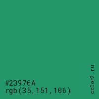 Цвет #23976A в цветовой модели RGB обозначается тремя октетами (35, 151, 106) в десятичном формате и #23976A в шестнадцатиричном (hex) формате, которые являются интенсивностью красного 35 (hex 23), интенсивность зелёного 151 (hex 97) и интенсивность синего 106 (hex 6A).