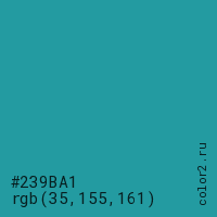 Цвет #239BA1 в цветовой модели RGB обозначается тремя октетами (35, 155, 161) в десятичном формате и #239BA1 в шестнадцатиричном (hex) формате, которые являются интенсивностью красного 35 (hex 23), интенсивность зелёного 155 (hex 9B) и интенсивность синего 161 (hex A1).