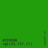 Цвет #239D0B в цветовой модели RGB обозначается тремя октетами (35, 157, 11) в десятичном формате и #239D0B в шестнадцатиричном (hex) формате, которые являются интенсивностью красного 35 (hex 23), интенсивность зелёного 157 (hex 9D) и интенсивность синего 11 (hex 0B).