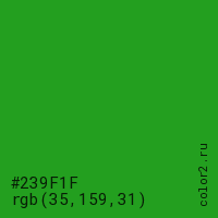Цвет #239F1F в цветовой модели RGB обозначается тремя октетами (35, 159, 31) в десятичном формате и #239F1F в шестнадцатиричном (hex) формате, которые являются интенсивностью красного 35 (hex 23), интенсивность зелёного 159 (hex 9F) и интенсивность синего 31 (hex 1F).
