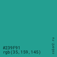 Цвет #239F91 в цветовой модели RGB обозначается тремя октетами (35, 159, 145) в десятичном формате и #239F91 в шестнадцатиричном (hex) формате, которые являются интенсивностью красного 35 (hex 23), интенсивность зелёного 159 (hex 9F) и интенсивность синего 145 (hex 91).