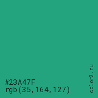 Цвет #23A47F в цветовой модели RGB обозначается тремя октетами (35, 164, 127) в десятичном формате и #23A47F в шестнадцатиричном (hex) формате, которые являются интенсивностью красного 35 (hex 23), интенсивность зелёного 164 (hex A4) и интенсивность синего 127 (hex 7F).