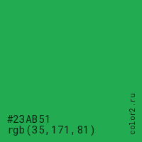 Цвет #23AB51 в цветовой модели RGB обозначается тремя октетами (35, 171, 81) в десятичном формате и #23AB51 в шестнадцатиричном (hex) формате, которые являются интенсивностью красного 35 (hex 23), интенсивность зелёного 171 (hex AB) и интенсивность синего 81 (hex 51).