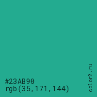 Цвет #23AB90 в цветовой модели RGB обозначается тремя октетами (35, 171, 144) в десятичном формате и #23AB90 в шестнадцатиричном (hex) формате, которые являются интенсивностью красного 35 (hex 23), интенсивность зелёного 171 (hex AB) и интенсивность синего 144 (hex 90).