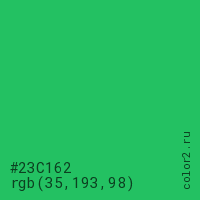 Цвет #23C162 в цветовой модели RGB обозначается тремя октетами (35, 193, 98) в десятичном формате и #23C162 в шестнадцатиричном (hex) формате, которые являются интенсивностью красного 35 (hex 23), интенсивность зелёного 193 (hex C1) и интенсивность синего 98 (hex 62).