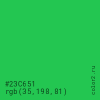 Цвет #23C651 в цветовой модели RGB обозначается тремя октетами (35, 198, 81) в десятичном формате и #23C651 в шестнадцатиричном (hex) формате, которые являются интенсивностью красного 35 (hex 23), интенсивность зелёного 198 (hex C6) и интенсивность синего 81 (hex 51).