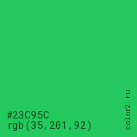 Цвет #23C95C в цветовой модели RGB обозначается тремя октетами (35, 201, 92) в десятичном формате и #23C95C в шестнадцатиричном (hex) формате, которые являются интенсивностью красного 35 (hex 23), интенсивность зелёного 201 (hex C9) и интенсивность синего 92 (hex 5C).