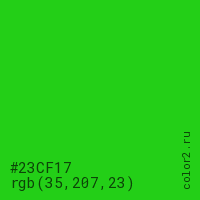 Цвет #23CF17 в цветовой модели RGB обозначается тремя октетами (35, 207, 23) в десятичном формате и #23CF17 в шестнадцатиричном (hex) формате, которые являются интенсивностью красного 35 (hex 23), интенсивность зелёного 207 (hex CF) и интенсивность синего 23 (hex 17).