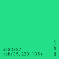 Цвет #23DF87 в цветовой модели RGB обозначается тремя октетами (35, 223, 135) в десятичном формате и #23DF87 в шестнадцатиричном (hex) формате, которые являются интенсивностью красного 35 (hex 23), интенсивность зелёного 223 (hex DF) и интенсивность синего 135 (hex 87).