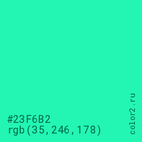 Цвет #23F6B2 в цветовой модели RGB обозначается тремя октетами (35, 246, 178) в десятичном формате и #23F6B2 в шестнадцатиричном (hex) формате, которые являются интенсивностью красного 35 (hex 23), интенсивность зелёного 246 (hex F6) и интенсивность синего 178 (hex B2).