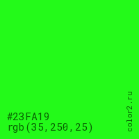 Цвет #23FA19 в цветовой модели RGB обозначается тремя октетами (35, 250, 25) в десятичном формате и #23FA19 в шестнадцатиричном (hex) формате, которые являются интенсивностью красного 35 (hex 23), интенсивность зелёного 250 (hex FA) и интенсивность синего 25 (hex 19).