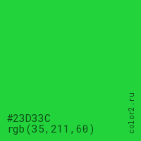 Цвет #23D33C в цветовой модели RGB обозначается тремя октетами (35, 211, 60) в десятичном формате и #23D33C в шестнадцатиричном (hex) формате, которые являются интенсивностью красного 35 (hex 23), интенсивность зелёного 211 (hex D3) и интенсивность синего 60 (hex 3C).