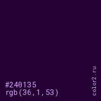 Цвет #240135 в цветовой модели RGB обозначается тремя октетами (36, 1, 53) в десятичном формате и #240135 в шестнадцатиричном (hex) формате, которые являются интенсивностью красного 36 (hex 24), интенсивность зелёного 1 (hex 01) и интенсивность синего 53 (hex 35).