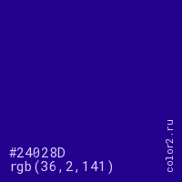 Цвет #24028D в цветовой модели RGB обозначается тремя октетами (36, 2, 141) в десятичном формате и #24028D в шестнадцатиричном (hex) формате, которые являются интенсивностью красного 36 (hex 24), интенсивность зелёного 2 (hex 02) и интенсивность синего 141 (hex 8D).