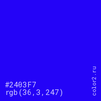 Цвет #2403F7 в цветовой модели RGB обозначается тремя октетами (36, 3, 247) в десятичном формате и #2403F7 в шестнадцатиричном (hex) формате, которые являются интенсивностью красного 36 (hex 24), интенсивность зелёного 3 (hex 03) и интенсивность синего 247 (hex F7).