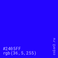 Цвет #2405FF в цветовой модели RGB обозначается тремя октетами (36, 5, 255) в десятичном формате и #2405FF в шестнадцатиричном (hex) формате, которые являются интенсивностью красного 36 (hex 24), интенсивность зелёного 5 (hex 05) и интенсивность синего 255 (hex FF).