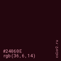 Цвет #24060E в цветовой модели RGB обозначается тремя октетами (36, 6, 14) в десятичном формате и #24060E в шестнадцатиричном (hex) формате, которые являются интенсивностью красного 36 (hex 24), интенсивность зелёного 6 (hex 06) и интенсивность синего 14 (hex 0E).