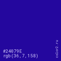 Цвет #24079E в цветовой модели RGB обозначается тремя октетами (36, 7, 158) в десятичном формате и #24079E в шестнадцатиричном (hex) формате, которые являются интенсивностью красного 36 (hex 24), интенсивность зелёного 7 (hex 07) и интенсивность синего 158 (hex 9E).